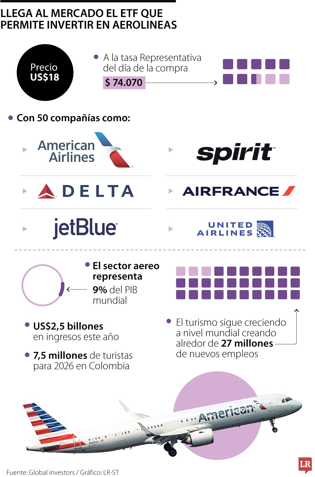“El ETF funciona como una canasta de acciones. Jets tiene 50 compañías dentro, 50 holdings. Pero se traza como una acción en el mercado. La puedes comprar y vender en cualquier momento. Entonces, cuando tú compras una acción de Jets a US$17 o US$18 tienes exposición a un universo impresionante en el mercado aéreo global”, añadió.