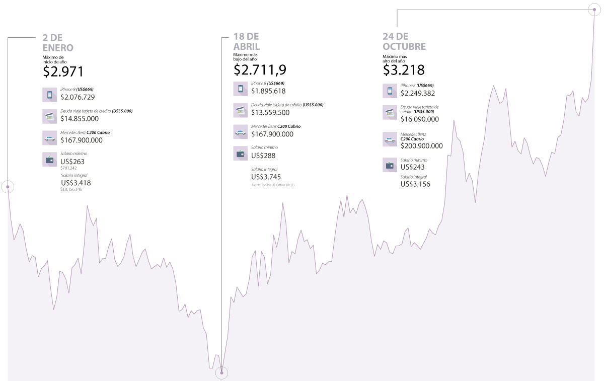 Todavía más práctico resulta el ejemplo al comparar lo que podía adquirir con ese dinero y ahora será más difícil. Una deuda en tarjeta de crédito por US$5.000, promedio para un viaje a los Estados Unidos, podría representarle en dinero local $14,8 millones a principio de año. Sin embargo, si usted piensa pagar su deuda hoy, esta le saldría $1,2 millones más cara que en enero.