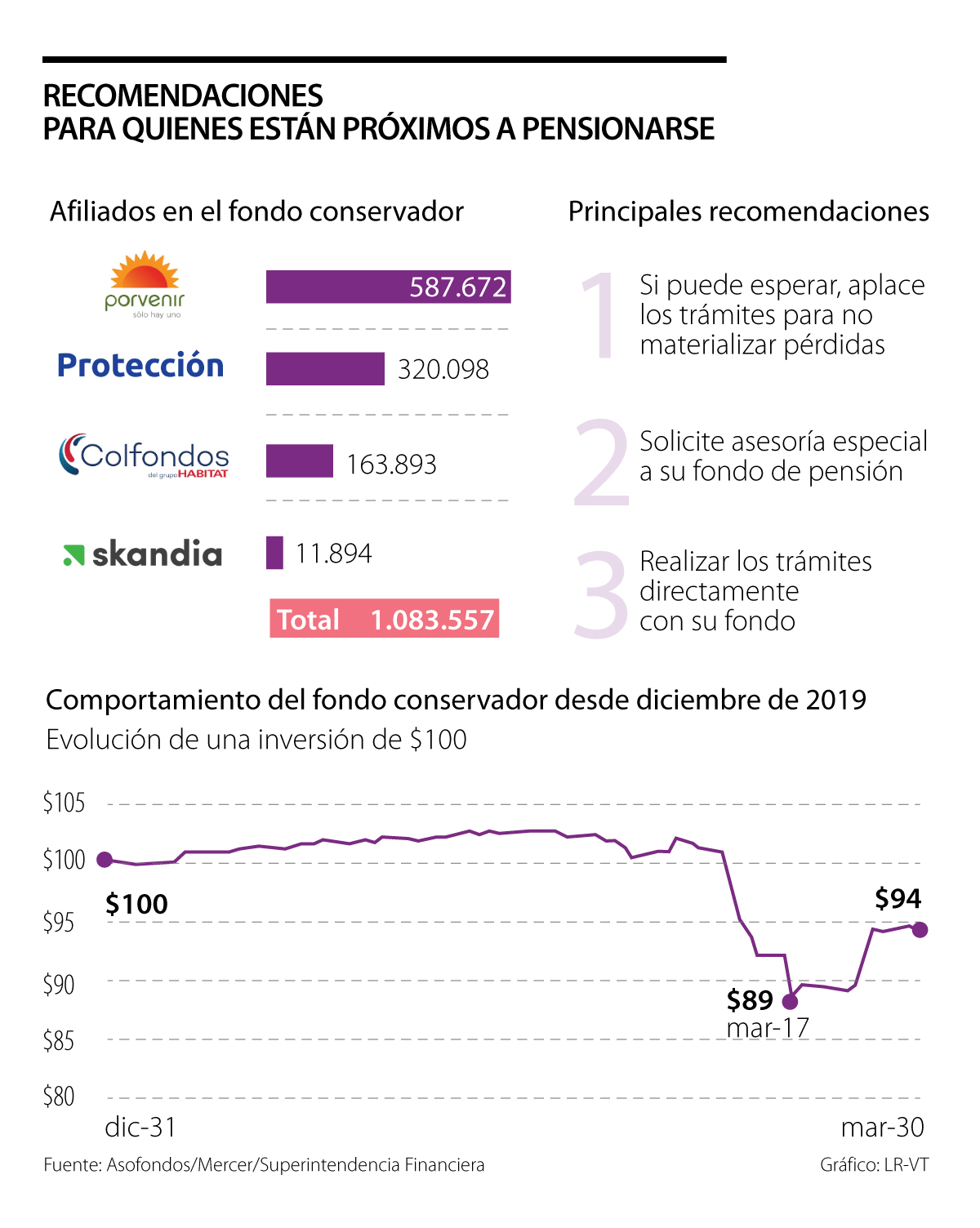 Finalmente, el gerente de inversiones de Mercer, Pablo Medina, concluyó que, en promedio, el cálculo para una pensión es de un salario mínimo por cada $300 millones de ahorro, (dos salarios para $600 millones y así sucesivamente) y, como hubo afectación en ese capital, “si hace el trámite hoy va a haber un golpe en la mesada proporcional a la caída del fondo conservador y, para quienes están a punto de pensionarse, sí sería recomendable posponer esa decisión unos seis meses, tiempo en el que estimamos que va a haber recuperación”.