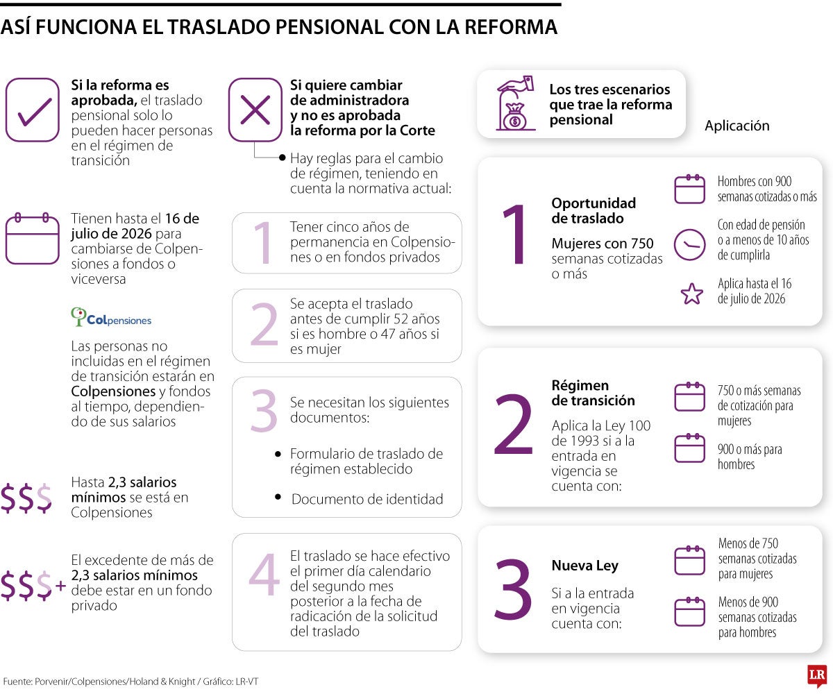 El dirigente gremial aseguró que, aun si se llega a caer la reforma, los traslados quedarán en firme al hacerse bajo el velo de la legalidad de la Ley 2381. “Si la gente se espera y la Corte tumba la ley, se cae la ventana del traslado y ya no podrá cambiarse cuando le falten menos de 10 años de pensión”, agregó. Esta figura a la que se refiere Velasco es conocida como traslado exprés.