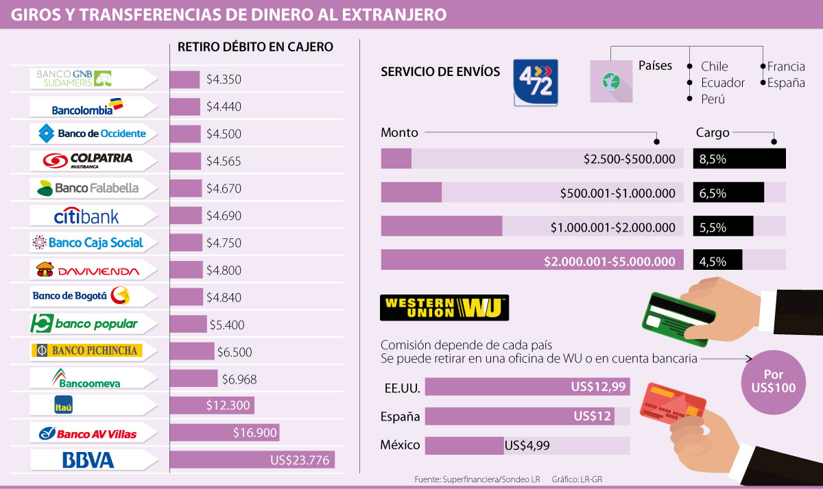 En el caso de que se quede sin dinero en el extranjero, también puede recurrir a la opción de que le giren dinero desde Colombia al país en donde se encuentre. Existen varias opciones por las cuales se puede enviar dinero desde Colombia, dos de ellas son 4-72 y Western Union. El servicio de 4-72 tiene disponible la opción de enviar giros desde $2.500 hasta $5 millones, con comisiones desde 4,5%, mientras que WU cobra dependiendo del país.
