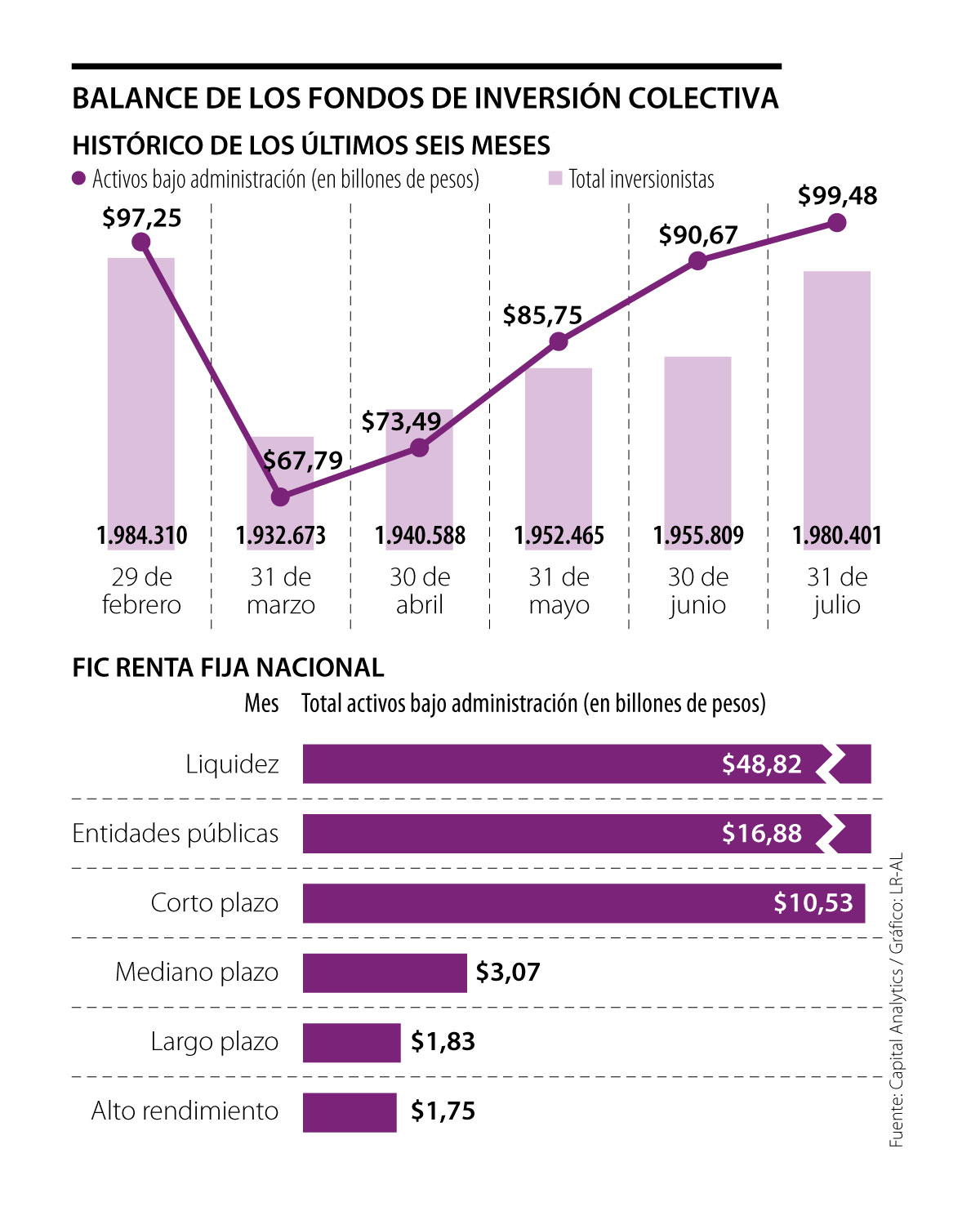 De acuerdo con información publicada por Capital Analytics, los AUM con los que cerraron los FIC el primer mes del segundo semestre del año son superiores a los que registraron el 29 de febrero ($97,25 billones), el último cierre de mes antes de que la pandemia desencadenara caídas históricas en el mercado de capitales.