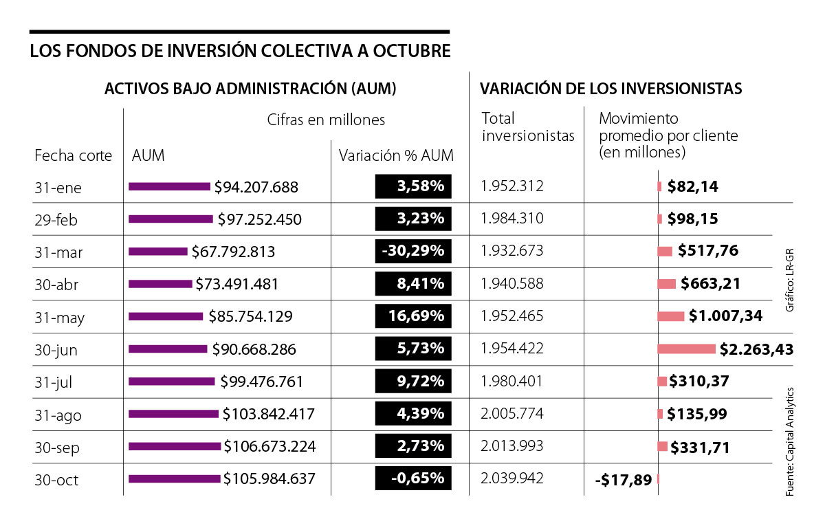De acuerdo con el balance realizado por Capital Analytics, lo que contribuyó más a la disminución de los AUM en octubre fueron los retiros de los inversionistas por $464.103 millones, mientras que las desvalorizaciones fueron de $224.484 millones (-2,50% efectivo anual).