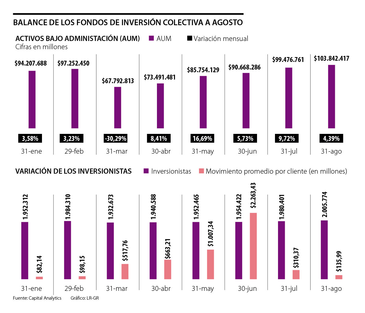 De acuerdo con las cifras reportadas por Capital Analytics, durante el octavo mes del año, los AUM de los fondos incrementaron $4,37 billones, así que los recursos administrados por la industria ascendieron a $103,84 billones, una cifra histórica que equivale a 9,77% del Producto Interno Bruto.
