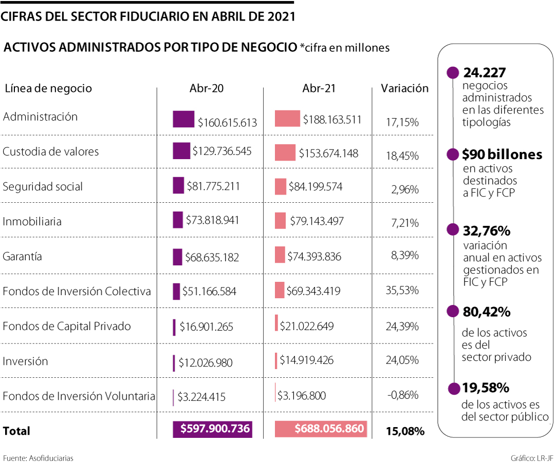Con una leve reactivación de la economía colombiana y a la espera de una mayor certeza de las finanzas del país, la Asociación de Fiduciarias de Colombia (Asofiduciarias) reportó un crecimiento de 15% en los activos administrados por el sector en abril, pasando de $597,9 billones a $688 billones.