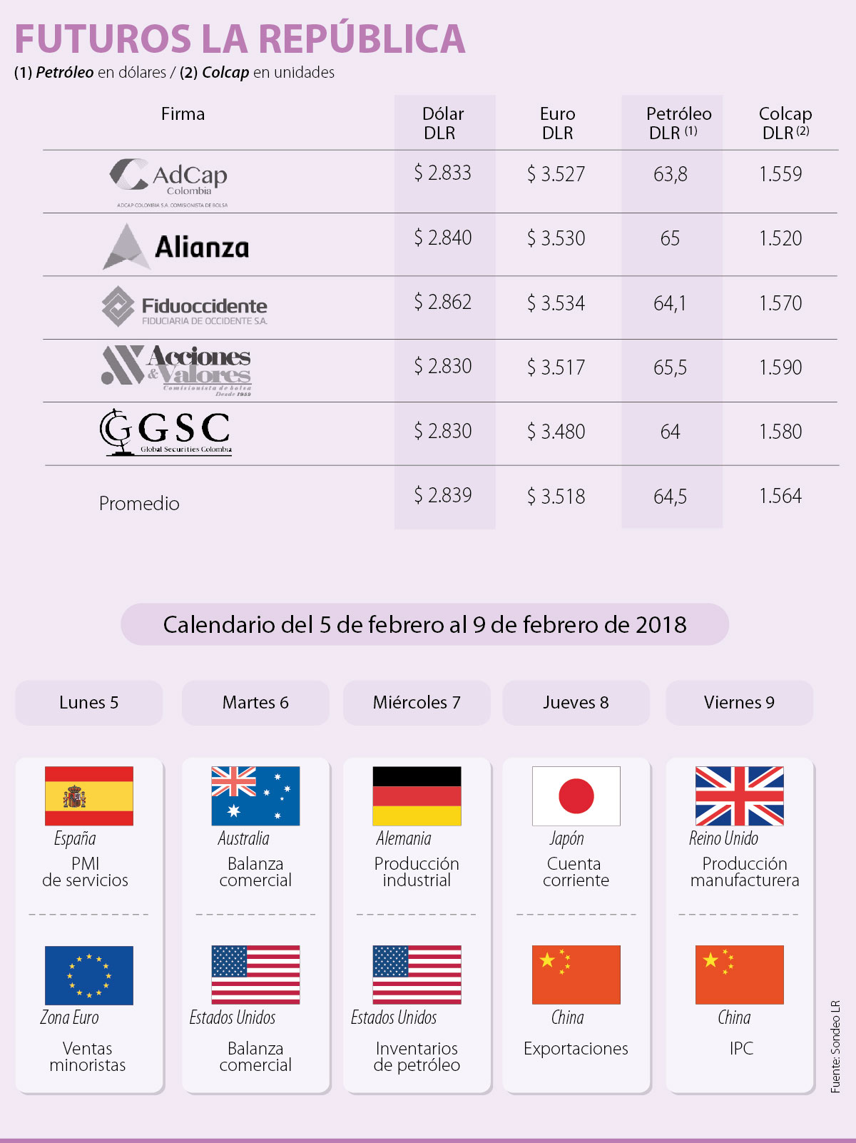 Por tal razón, los analistas esperan que esta semana la moneda esté en un precio promedio de $2.839, muy cerca al valor de cierre del viernes, el cual fue de $2.832.