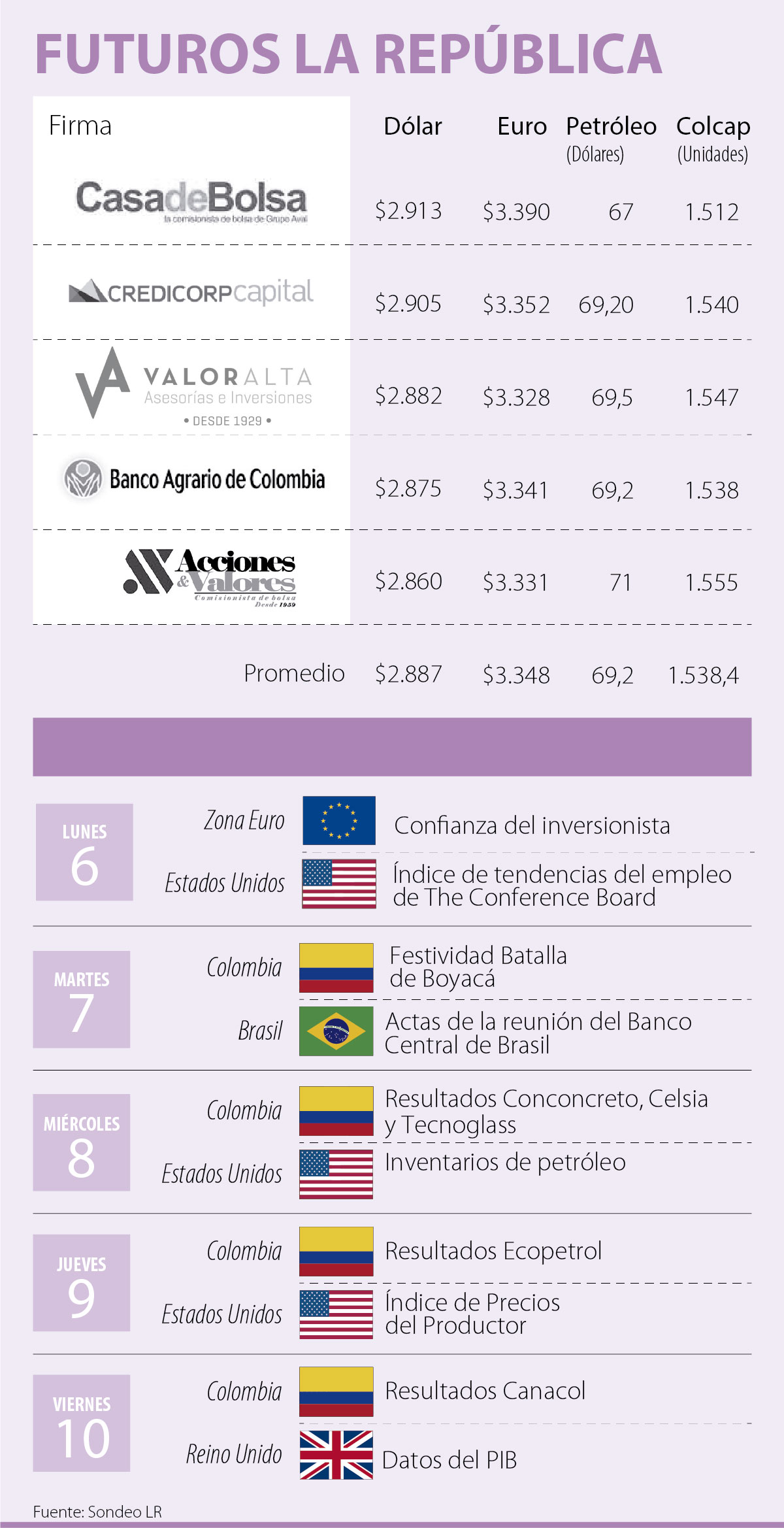 Javier Felipe Ochoa, analista económico de Valoralta Asesorías e Inversiones señaló que el dólar “ha llegado a un precio importante en el que se ha estabilizado en un valor de $2.880”, y explicó que para esta semana “no hay muchos datos en la agenda económica”. Sin embargo, el analista agregó que lo que suceda en Japón con el yen nuevamente puede ser significativo para la divisa pues “los datos del PIB de ese país serán muy importantes. Lo que pase con el yen puede mover todo el mercado de divisas porque es una de las seis monedas más fuertes frente al dólar”.