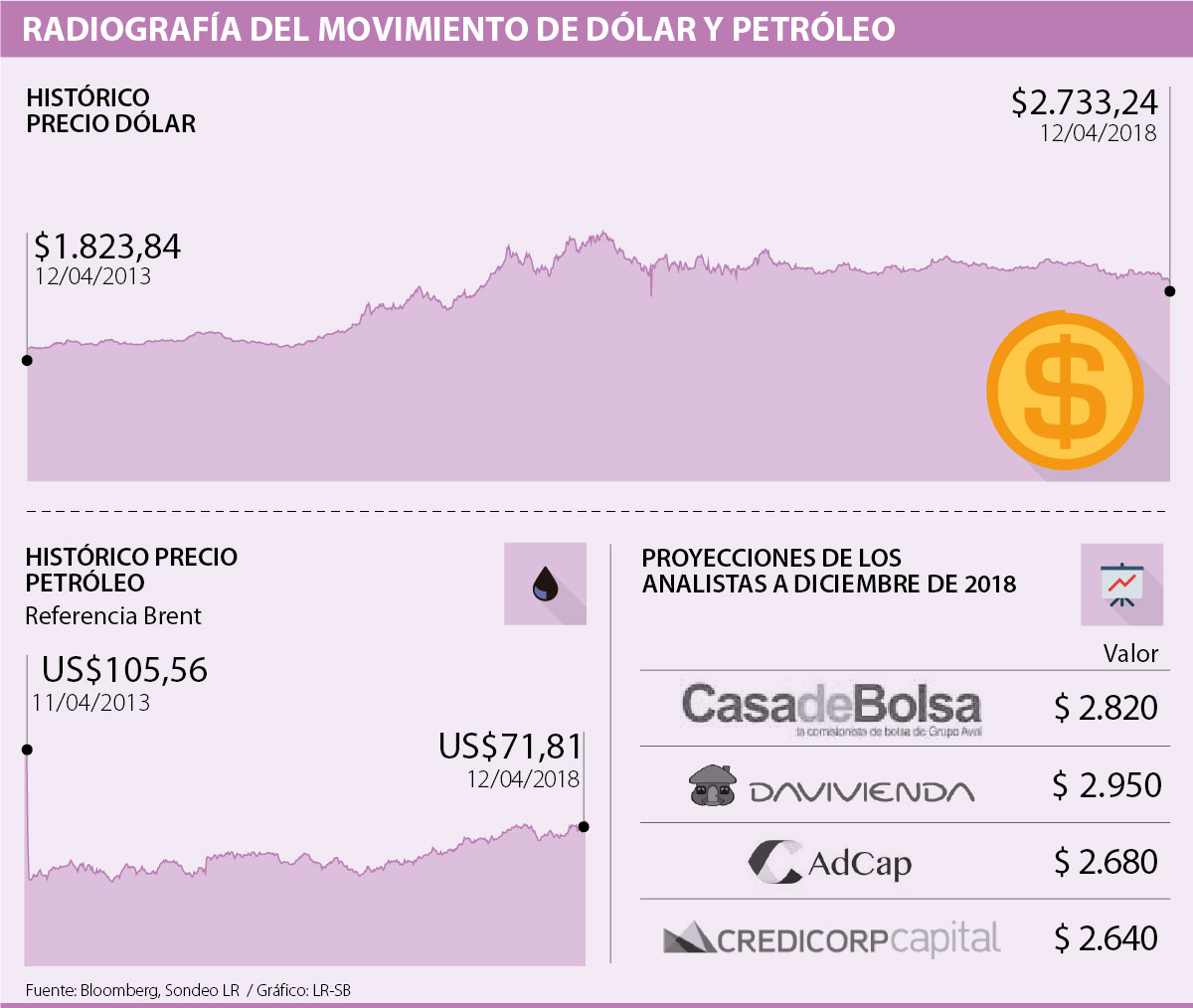 Estos cambios, que se generaron por la tensión geopolítica y la expectativa de una guerra comercial, alteraron en solo tres días las expectativas de los analistas, que en febrero proyectaban que la moneda terminaría con un precio entre $3.000-$3.150. Hoy, el sondeo arroja que el dólar cerraría en promedio en $2.750; siendo Casa de Bolsa quien tiene la meta más baja con $2.640 y Davivienda la más alta en $2.950; $200 por debajo de la proyección de hace dos meses.