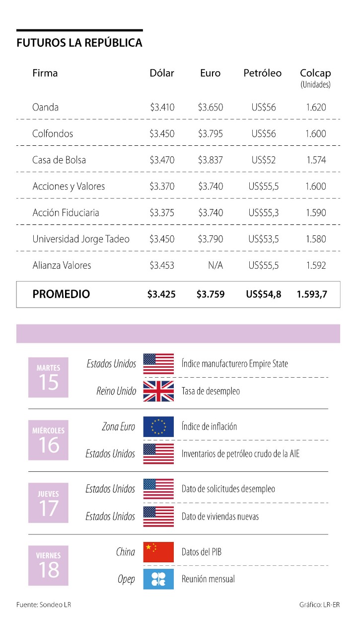 Hoy, tras el lunes festivo, se espera que el mercado local reciba las novedades, por lo que los analistas proyectan una recuperación del peso colombiano en promedio a $3.425. Sin embargo, hay grandes diferencias entre las proyecciones otorgadas por los expertos.