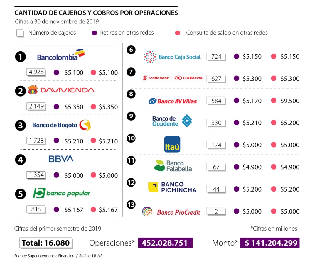 Cinco bancos no cobran por retiros en sus canales (Banco Caja Social, Scotiabank Colpatria, Falabella, Pichincha y Procredit). Continúan AV Villas ($1.690); Banco de Occidente, Banco Popular, Davivienda y Banco Bogotá, los tres con $1.700; Bbva e Itaú, ambos con $1.950; y Bancolombia ($3.000).
