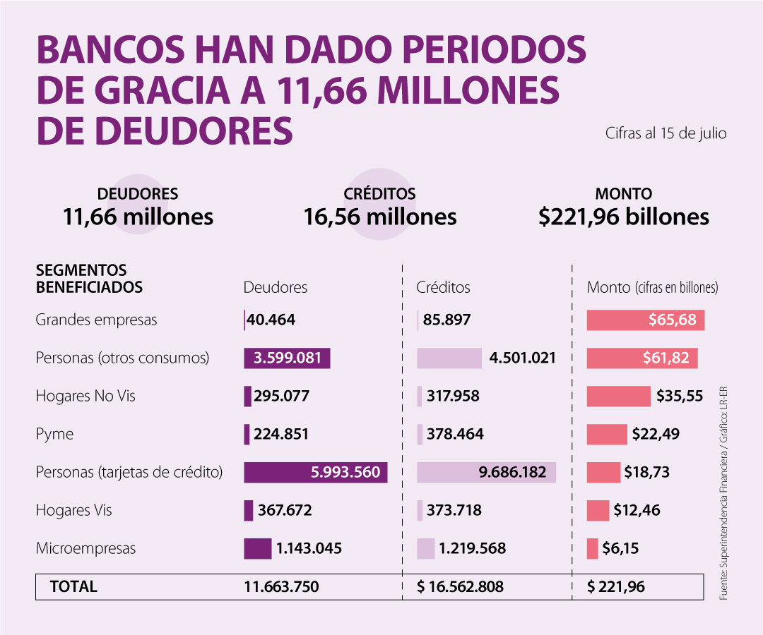La Superintendencia Financiera detalló que los planes de gracia que los bancos han otorgado al 22 de julio han beneficiado a 11,66 millones de deudores (personas naturales y jurídicas), con 16,56 millones de créditos por un saldo de cartera de $221,96 billones.