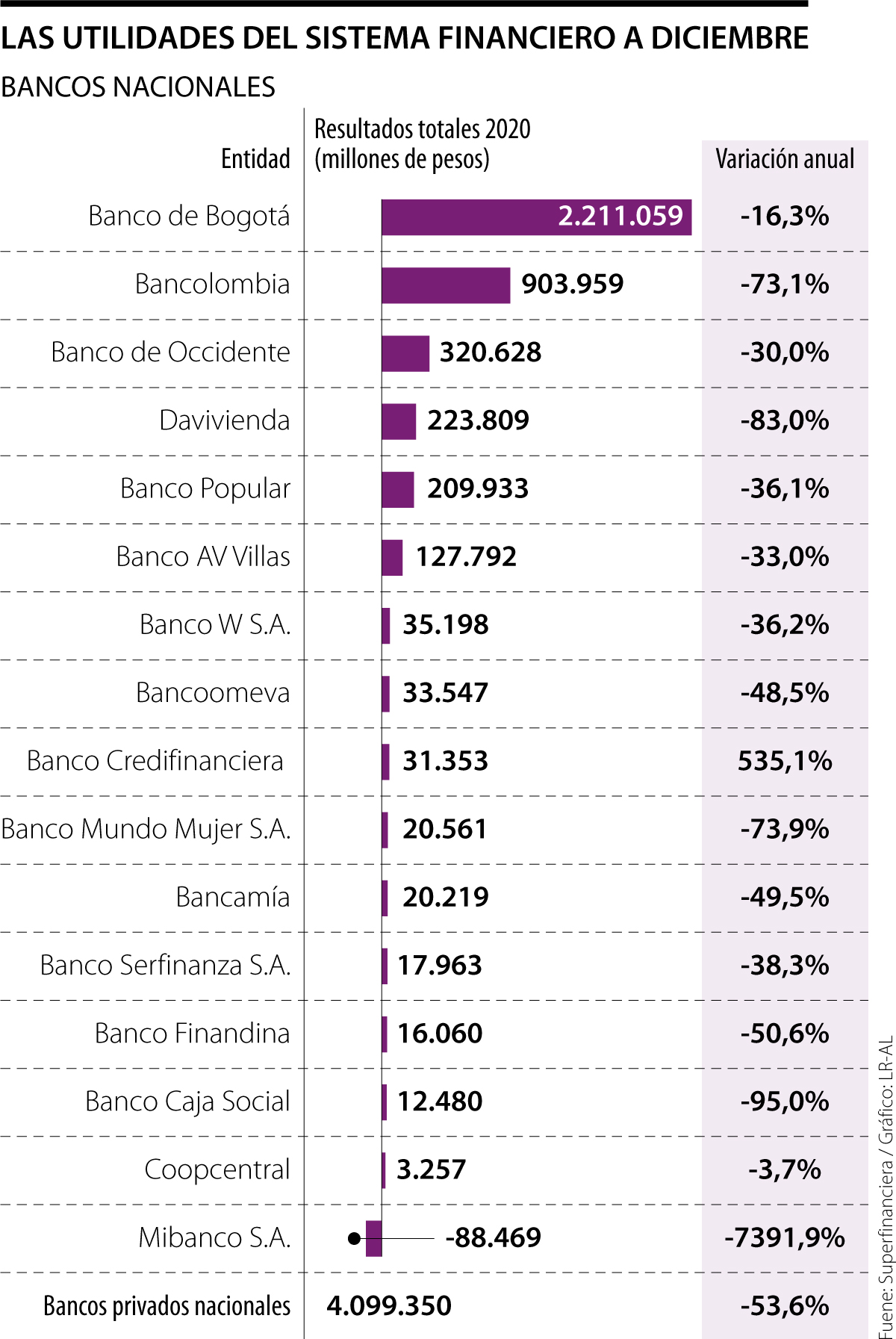 En medio de este desplome de utilidades, Banco de Bogotá, Bancolombia, Banco de Occidente, Davivienda y Banco Popular fueron las entidades nacionales que más registraron ganancias, con $2,21 billones, $903.959 millones, $320.628 millones, $223.808 millones y $209.933 millones, respectivamente.