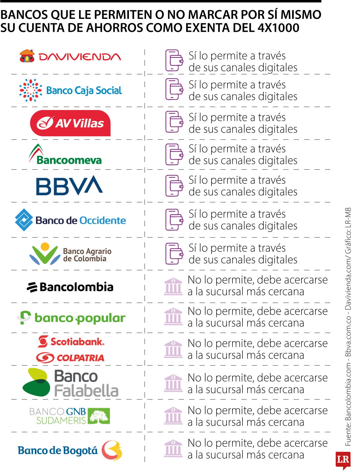 Según Asobancaria, los titulares de cuentas, pueden marcar una cuenta de ahorros como exenta del 4x1.000, no obstante, si la cuenta sobrepasa $14,8 millones en movimientos mensuales, también tendrá que rendir cuentas con el impuesto.