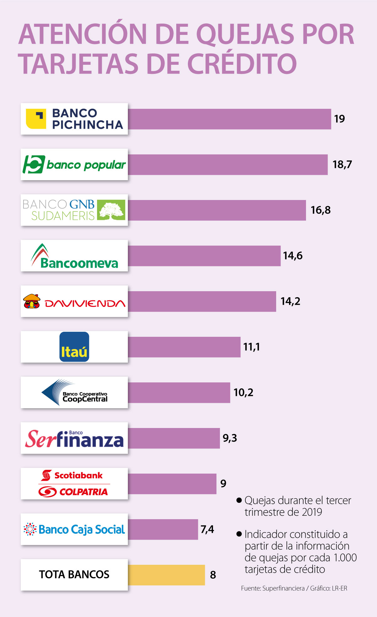 De acuerdo con un indicador elaborado por la entidad, que toma el total de las quejas en trámite con relación a la entidad bancaria para cada 1.000 tarjetas de crédito, el banco Pichincha es que que registra un balance más alto en relación con la falta de atención a estas quejas (19).
