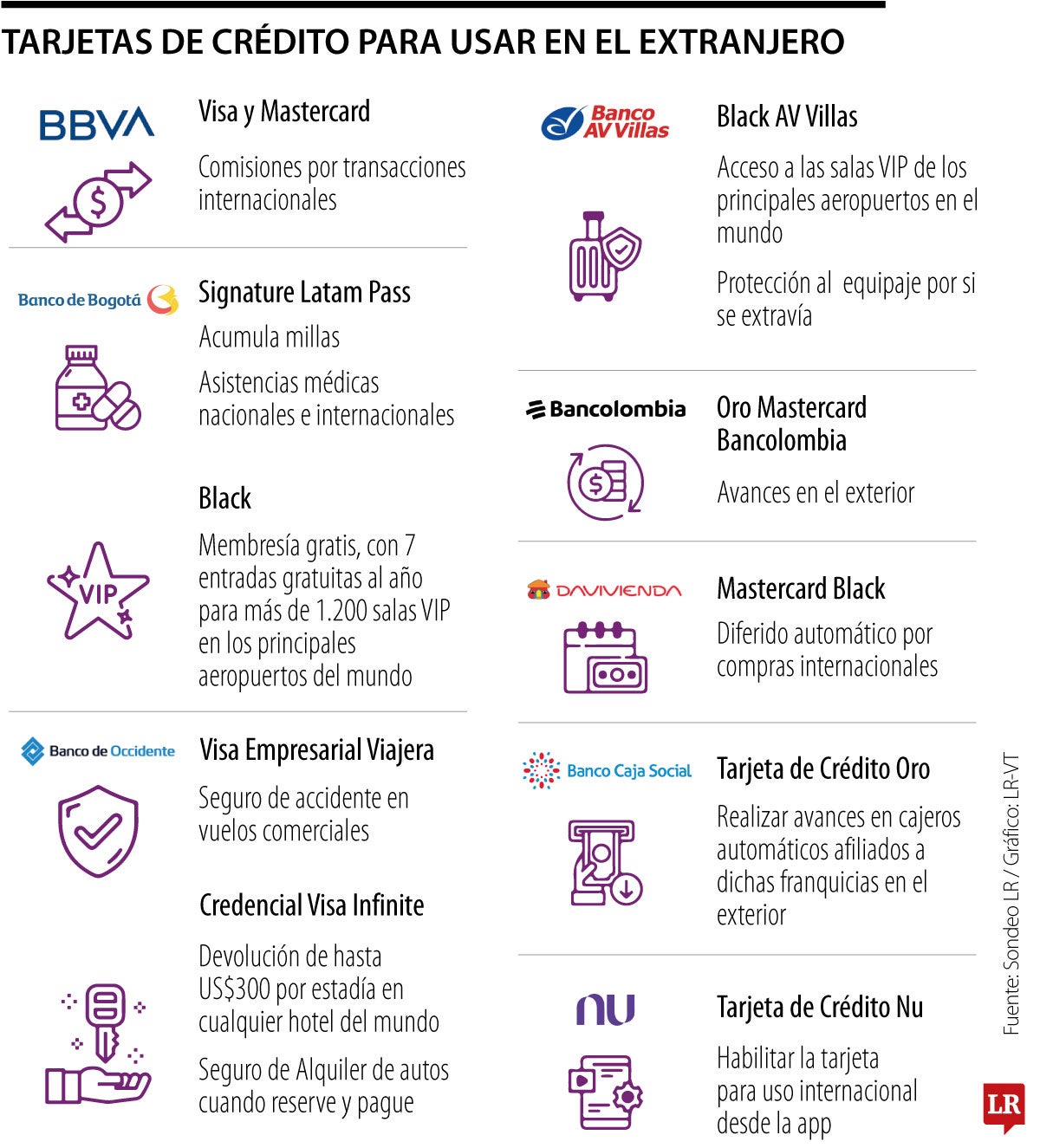 Bbva tiene tarjetas Visa y Mastercard con conversión de moneda, y la tarjeta Black de AV Villas asegura el equipaje. Con Nubank se puede actualizar la tarjeta en modo internacional desde la app para usarla en comercios de 200 países.