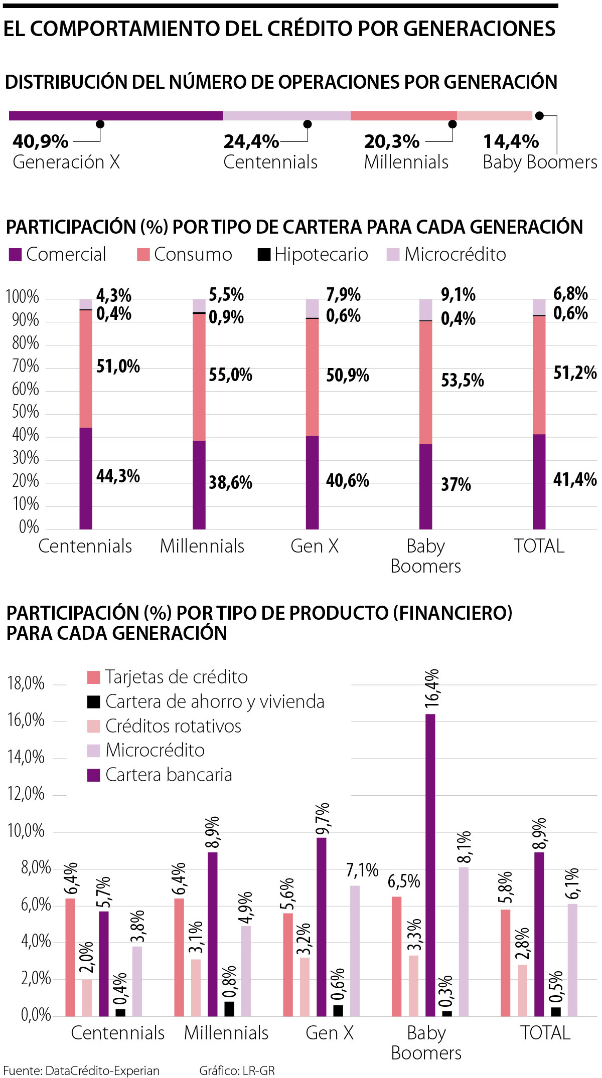 Además del acceso al crédito que registraron los consumidores de acuerdo a su edad, el estudio de Datacrédito Experian resaltó que los centennials utilizan más la cartera comercial que las otras generación (44,3%), los millennials tienen más participación en la cartera de consumo con una cifra de 55,0% y es la generación que mayor está presente en la cartera hipotecaria con 0,9% del total, debido a que están adquiriendo su primera vivienda.