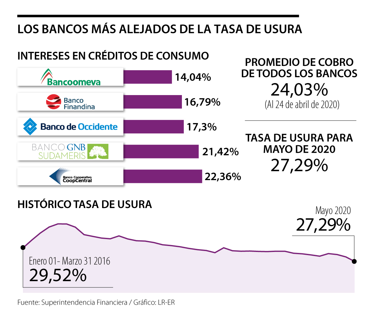 Al 24 de abril, el promedio de cobro de los bancos en intereses de créditos de consumo era de 24,03%, 326 puntos por debajo de la actual usura. Coomeva, con 14,04%, es el banco con la mejor oferta y el más alejado al índice máximo; seguido por Finandina, con una tasa de 16,79%. Continúan Banco de Occidente, con 17,30%; GNB Sudameris, con 21,42%; y Coopcentral, con 22,36%.