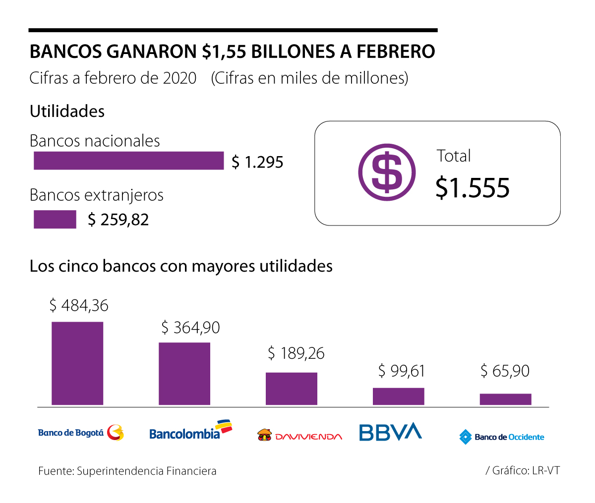 Según la Superintendencia Financiera, al primer bimestre de 2020 (enero-febrero), los 25 bancos nacionales y extranjeros que operan en Colombia reportaron utilidades por $1,55 billones, lo que representó una reducción anual de 2,28%.