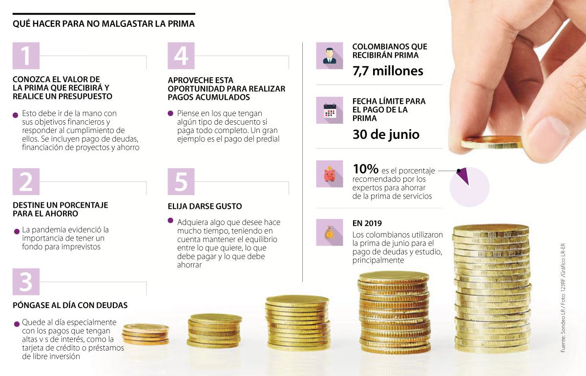 LR consultó a una serie de expertos que brindaron cinco consejos para no malgastar la prima. “Uno de los errores más frecuentes de los colombianos es que se gastan la prima antes de recibirla y no realizan una buena planificación de este recurso, el no tener un presupuesto claro dificulta tener control sobre los bienes y servicios que adquirimos que no son tan necesarios en esta época. Por esta razón, es importante incentivar la educación financiera desde una edad temprana, para tener un control de gastos y tener una mayor capacidad de ahorro”, comentó David Nieto Martínez, director del programa de Finanzas de la Universidad El Bosque.