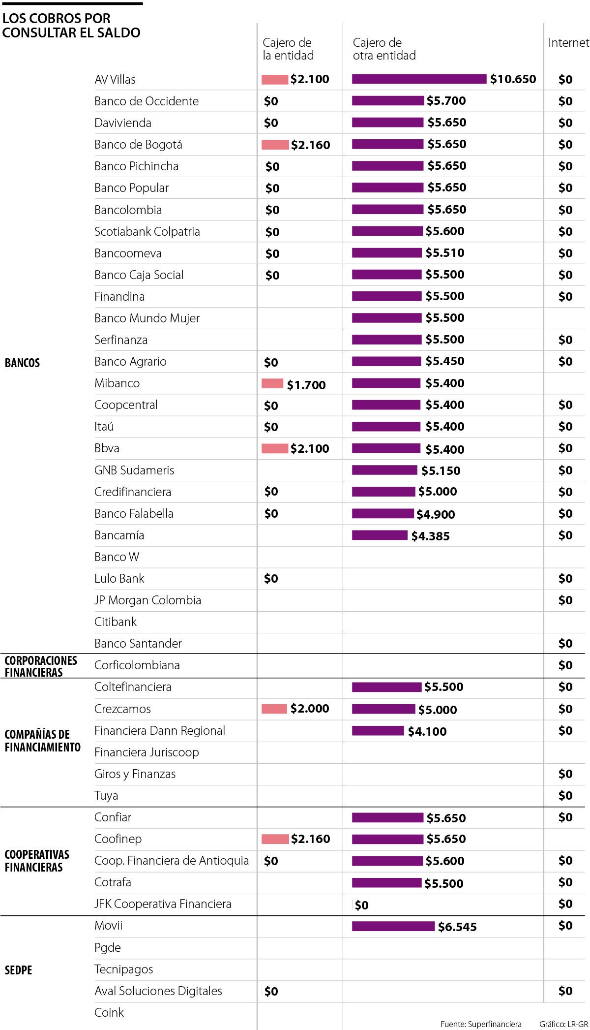 Pese a que es algo tan común e importante, algunas entidades financieras cobran la consulta de saldo, incluso en cajeros automáticos propios. AV Villas cobra en su red de cajeros $2.100 por esa acción; Mibanco cobra $1.700; el costo en Banco de Bogotá es de $2.160; Bbva tiene una tarifa de $2.100; en Financiera Juriscoop el costo es de $2.000 y JFK Cooperativa Financiera cobra $2.160. Cabe destacar que algunos bancos o compañías de financiamiento no cuentan con cajeros propios, sin embargo, están aliadas a otras redes como Servibanca, entre otras.