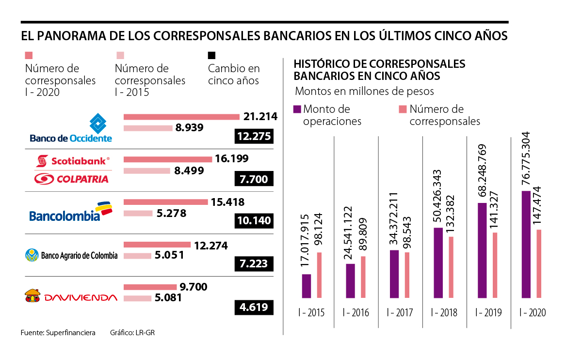 Además de ser las entidades con más corresponsales bancarios en el país a junio de este año, estas compañías han sumado varias sucursales en los últimos cinco años. Banco de Occidente adicionó 12.275 puntos; Scotiabank Colpatria, 7.700; Bancolombia, 10.140; Banco Agrario, 7.223; y Davivienda, 5.619.