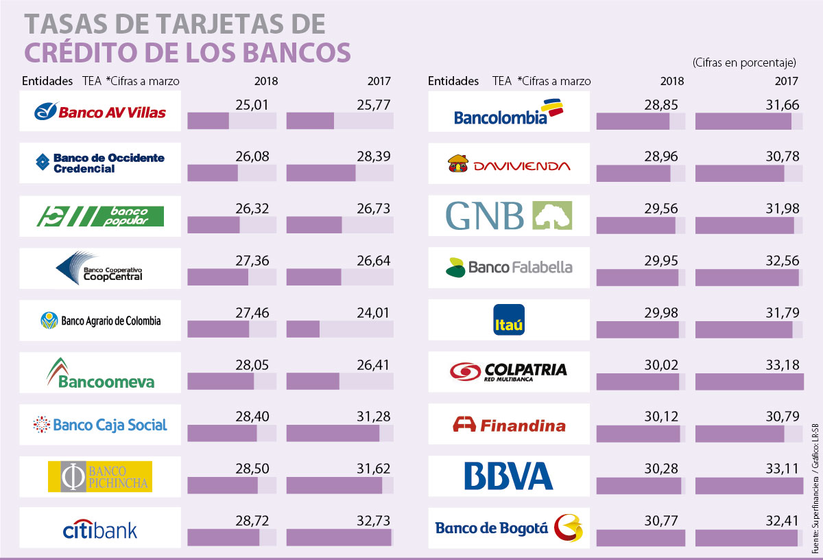 Teniendo en cuenta que las tasas que manejan estos créditos son similares a las que ofrecen los bancos en las tarjetas de crédito, a marzo de este año bancos como Bancolombia, AV Villas, Banco de Occidente, Banco Popular, Davivienda y otros, manejan cobros efectivos anuales que se ubican entre 20,34% y 30,77%, teniendo como promedio 28,58% de tasa de interés, que comparada con el promedio de 2017 que fue de 30,10%, lo que significó una disminución de 5,34 puntos porcentuales.