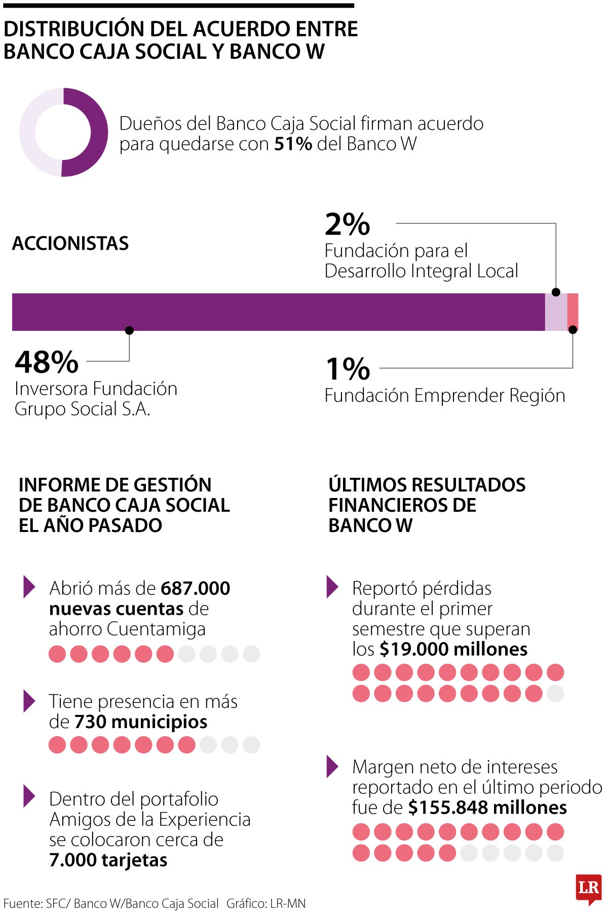 Los dueños del Banco Caja Social se quedarán con 51% del Banco W, según una información dada a conocer a través de la Superintendencia Financiera. El documento destaca que tres entidades que forman parte de la Fundación Grupo Social suscribieron el acuerdo de compraventa para quedarse con ese porcentaje del banco de origen caleño.