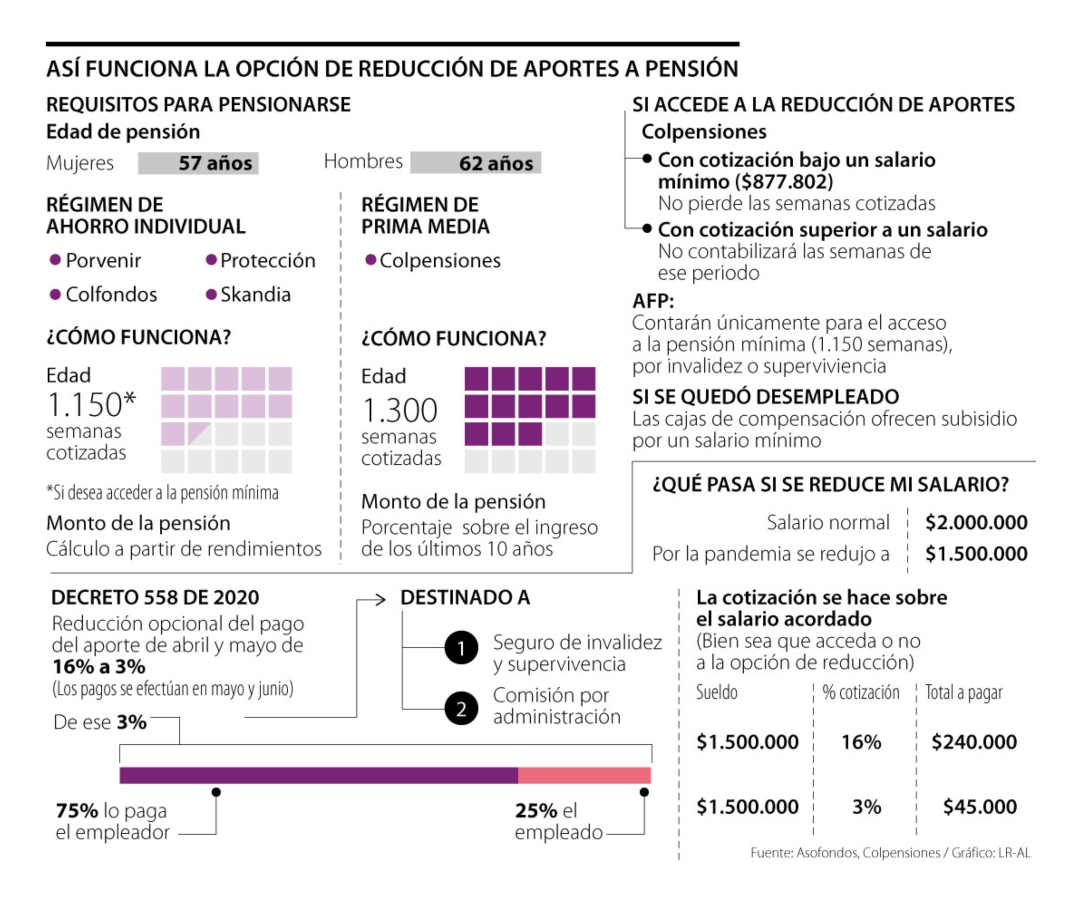 La cotización normal para pensión es de 16%: 12% lo paga el empleador y 4% el trabajador. El Decreto redujo opcionalmente ese aporte de 16% a 3% (2,25 puntos los asume la empresa y 0,75 puntos por el empleado / o la totalidad si es trabajador independiente).