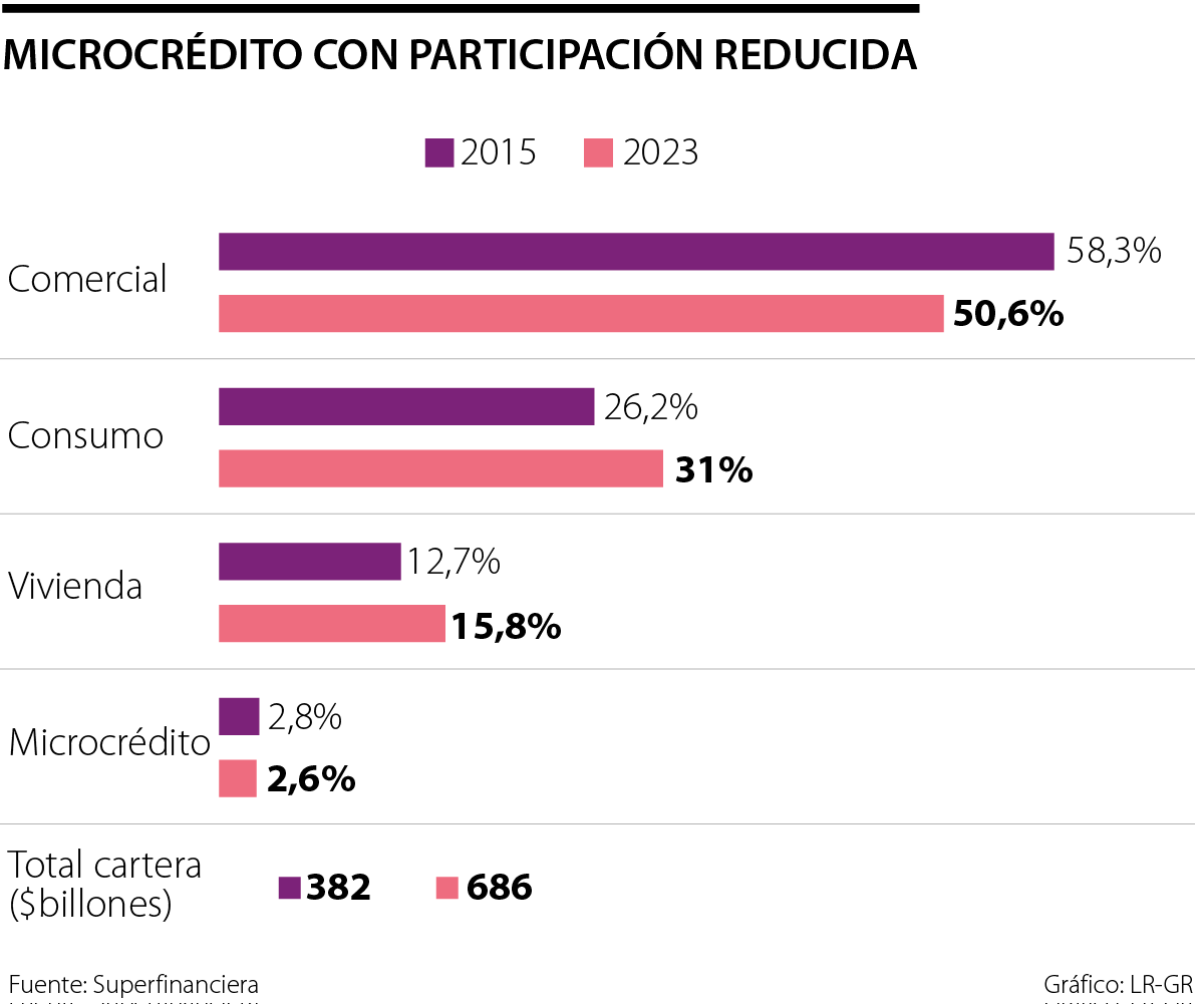 Por ejemplo, en 2015, esta modalidad de crédito ocupaba 2,8% del total de la cartera, algo que no ha variado mucho, pues a mayo de 2023, el microcrédito ocupa 2,6%.