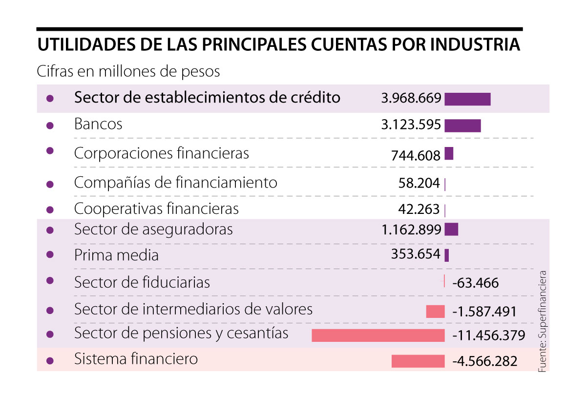 Por el contrario, los establecimientos de crédito ($3,97 billones), el régimen de prima media ($353.654 millones), las aseguradoras ($1,16 billones), los proveedores de infraestructura ($130.125 millones y las instituciones oficiales especiales ($2,94 billones) registraron ganancias.