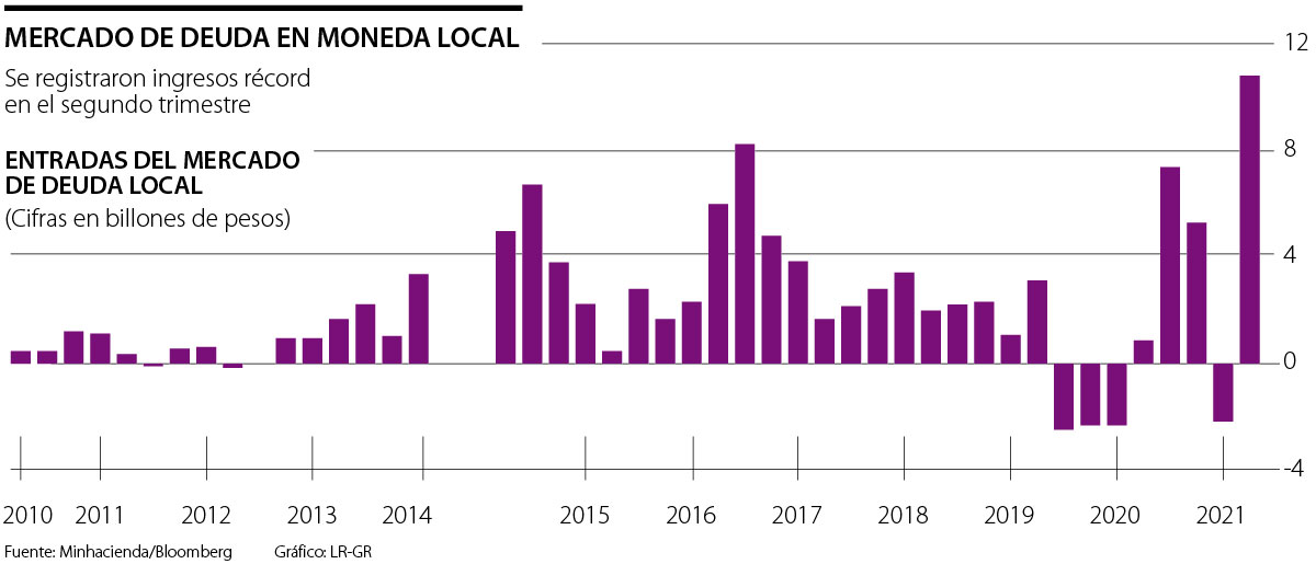 Las entradas netas aumentaron a un récord sin precedentes de $10,8 billones de pesos (US$2.800 millones) en los tres meses hasta junio, un 30% por encima del máximo trimestral anterior establecido en 2016. Y las notas han comenzado a superar a sus pares andinos en las últimas semanas después de un duro comienzo de el año. Los inversores han quedado impresionados por las promesas del gobierno de enderezar el barco después de perder el estatus de grado de inversión, y un crecimiento económico más rápido debería ayudar a fortalecer las arcas del gobierno, según dijo Alejandro Arreaza, analista de Barclays Capital Inc.