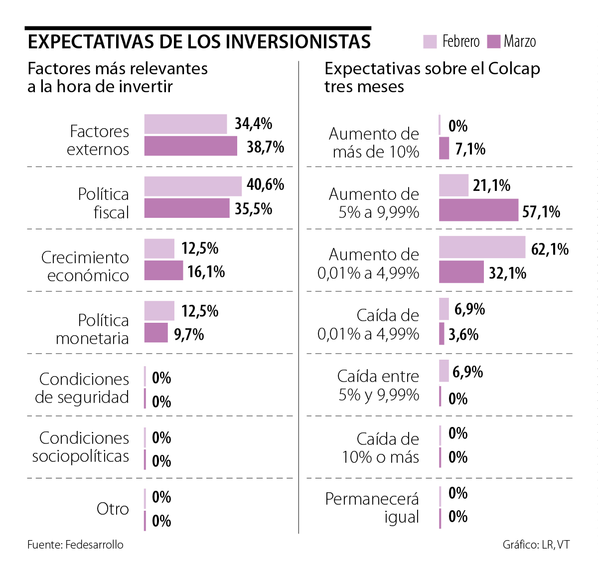 Fedesarrollo dio a conocer los resultados de la Encuesta de Opinión Financiera para marzo, en la que se detalla que los factores externos son considerados como los aspectos más importantes a la hora de invertir por los expertos, pasando de 34,4% a 38,7% del total con respecto a la encuesta de febrero.