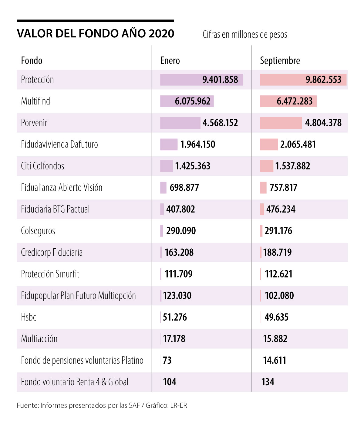 Los fondos que jalonaron este crecimiento fueron Protección con 13.008 afiliados más en septiembre, al pasar de 435.653 en enero a 448.661 al cierre del noveno mes del año; y Porvenir, el cual sumó 3.700 inscritos, ya que pasó de 181.867 en el primer mes del año a 185.567 al cierre de septiembre.