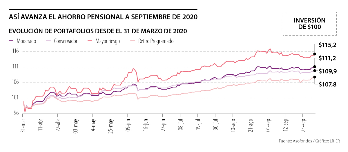 "Es así como una inversión de $100, al 31 de marzo, en el fondo moderado ya representaba $111,2 al cierre de septiembre. Por su parte, esta misma inversión en los portafolios de mayor riesgo, conservador y de retiro programado, se incrementó hasta $115,2, $109,9 y $107,8, respectivamente", citó Asofondos.