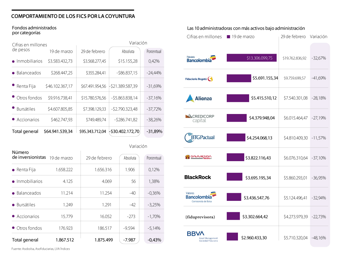Para ello se compararon los activos bajo administración y el número de inversionistas del 29 de febrero con los del 19 de marzo. En estas cerca de tres semanas, los recursos administrados en los FIC disminuyeron 31,88%, es decir que cayeron $30,40 billones, pues pasaron de $95,42 billones a $65,01 billones.