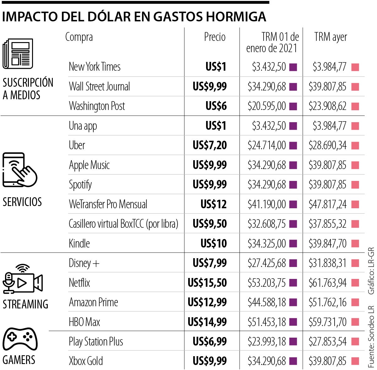 Entre los productos que los colombianos han visto aumentar su costo se encuentran la suscripción a The New York Times, la cual tiene un valor mensual de US$1. Una membresía de The Wall Street Journal, que tiene un precio estándar de US$9,99 mensuales, pasó de representar $34.290 a inicios de 2021 a $39.807 hoy.