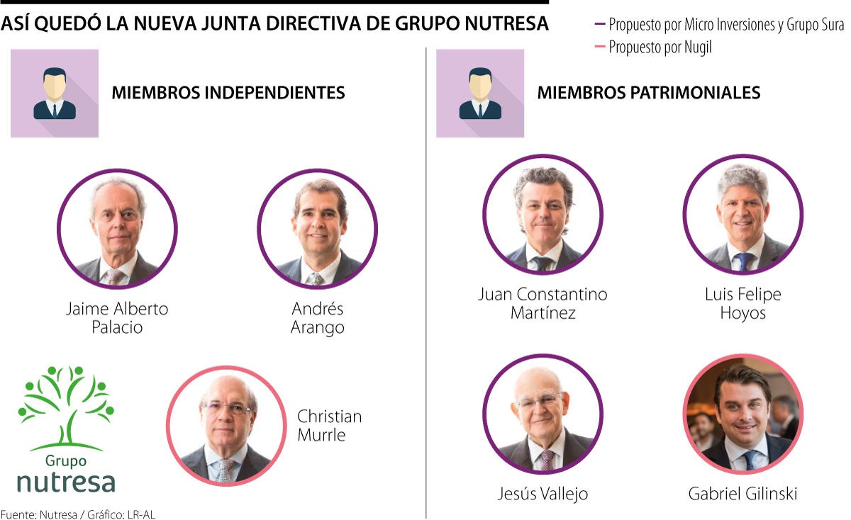 De esta forma, la Junta de Grupo Nutresa quedó conformada así: como miembros independientes estarán Jaime Alberto Palacio, Andrés Arango B., ambos postulados por Grupo Sura y Micro Inversiones; y Christian Murrle, nominado por Nugil. Como miembros patrimoniales quedaron Juan Constantino Martínez; Luis Felipe Hoyos; Jesús Vallejo (nominados por Sura y Micro Inversiones); y Gabriel Gilinski.