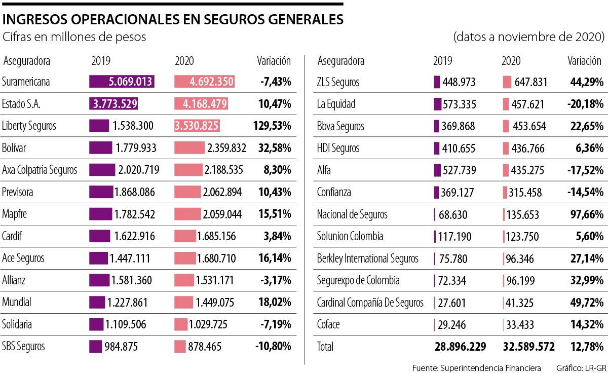 Con corte a noviembre del año pasado, los ingresos operacionales por seguros generales, que incluyen pólizas para carros, vivienda y otros activos que no involucran capital humano, acumularon $32 billones, lo que representa un crecimiento de 12,78% frente al mismo periodo de 2019.