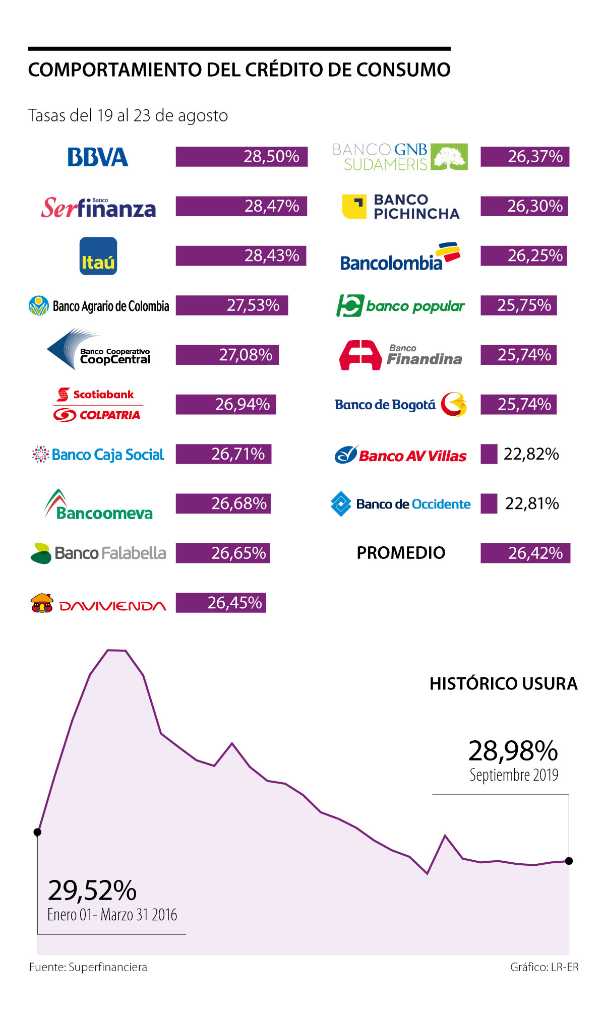 Por el contrario, los bancos que han fijado sus topes para créditos de consumo y ordinarios más lejos de la usura son Banco de Occidente, que presta a 22,81%; AV Villas, cuya tasa es de 22,82%, y en tercer lugar se ubican Banco de Bogotá y Banco Finandina, pues ambos cobran a 25,74%.