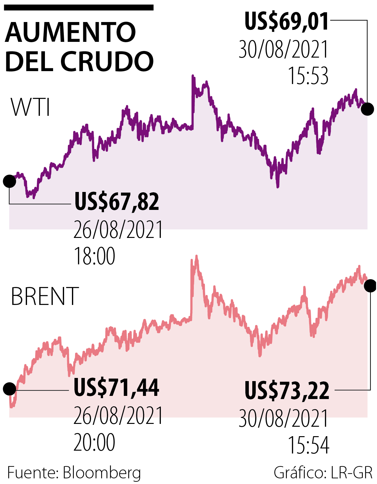 Ayer, el petróleo WTI aumentó 0,42% a US$69,01, mientras que el barril de crudo Brent creció 0,74% a US$73,22.