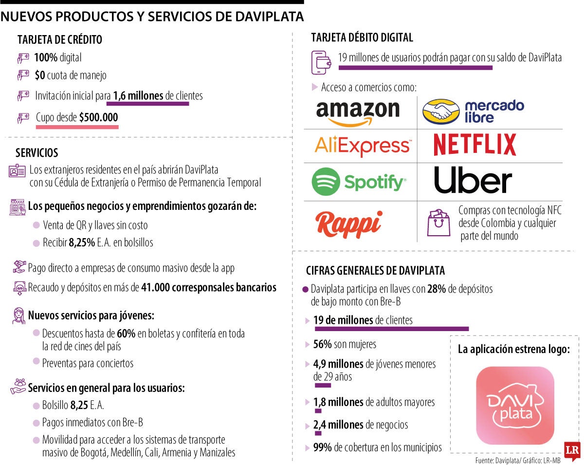 Davivienda anunció una transformación total de Daviplata. La billetera digital ofrecerá servicios de neobanco e, incluso, lanzó un nuevo logo con el que piensa incursionar en nuevos segmentos de mercado. La aplicación ofrecerá una tarjeta de crédito con la que competirá en este rubro con otros plásticos; también ofertará una nueva tarjeta de débito digital, ambas sin cuotas de manejo.
