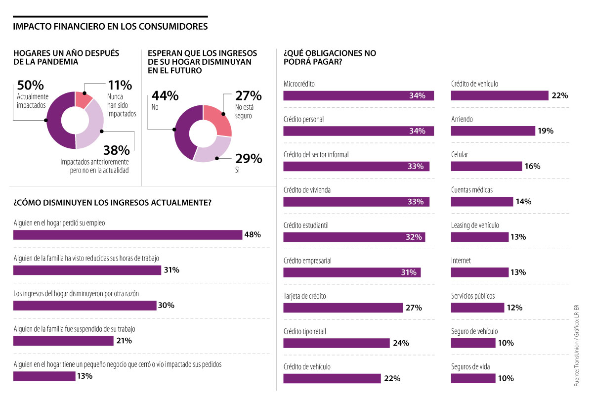 En marzo de 2021, 50% de los consumidores colombianos dijo que sigue estando afectado financieramente por el covid-19, una disminución de 22 puntos porcentuales desde diciembre del año pasado. Adicionalmente, el estudio publicado por TransUnion reveló que 38% de los encuestados indicó haberse visto afectado negativamente por la pandemia en el pasado, pero ya se recuperó. Mientras que solo 7% afirmó que sus finanzas se han recuperado totalmente, 62% afirmó que se han recuperado parcialmente y 31% dijo que estas siguen golpeadas.