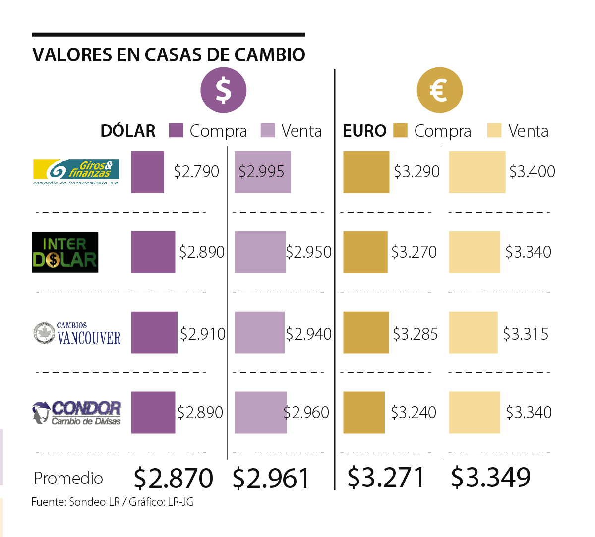 El valor más bajo lo encuentra en Cambios Vancouver, que lo vende a $2.940, seguido de Inter Dólar, que esta semana ofrece un dólar por $2.950. El más costoso es Giros & Finanzas, donde se consigue a $2.995.