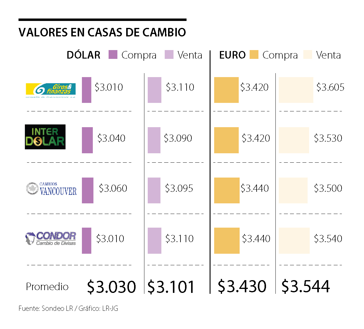 Esta semana, las casas de cambio consultadas por LR estarán vendiendo, en promedio, un euro en $3.544, $61 por debajo del precio que proyectan los analistas en el mercado spot.