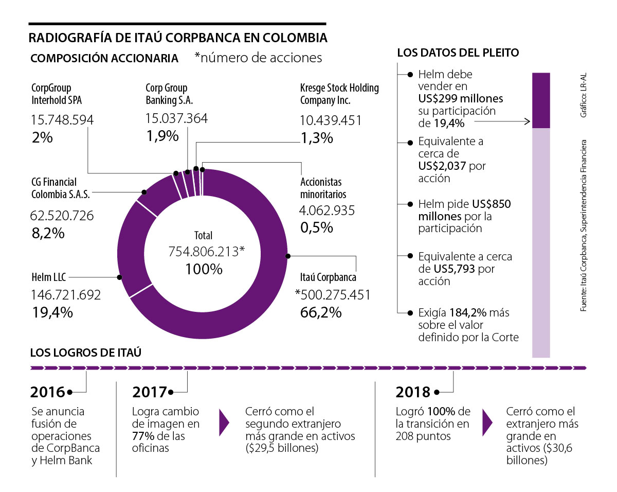 La historia viene de hace tres años cuando Itaú anunció su llegada a Colombia tras la fusión de CorpBanca y de Helm Bank. En ese mismo año este último inició un arbitraje en la Corte de Arbitraje Internacional, en el que específicamente se solicitó que Itaú Corpbanca y CorpGroup realizaran las adquisiciones de sus acciones en Itaú Colombia al mismo precio establecido en el acuerdo de transacción, suma que se estipulaba en US$850 millones al calcular una tasa de interés de 9% desde la firma del acuerdo de transacción.