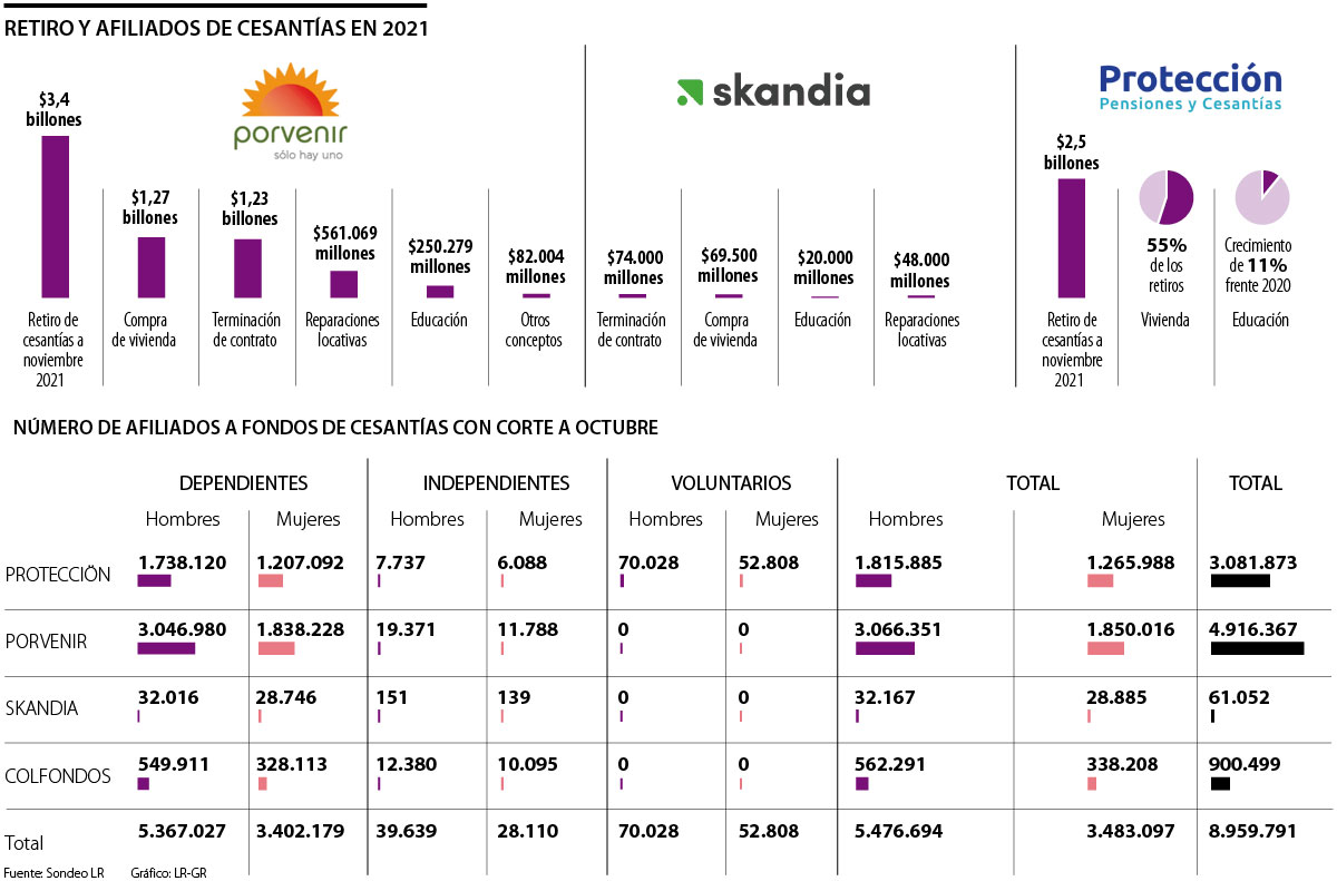 Otro rubro que llamó la atención fue el de terminación de contrato, pese a que la última cifra del Departamento Administrativo Nacional de Estadística (Dane) apuntó a que noviembre tuvo el desempleo más bajo de la pandemia (10,8%), aún el dato no se ubica en el nivel de 2019 (9,3% en el mismo mes). Porvenir destinó $1,23 billones a este propósito, para Skandia fue el rubro con más retiros con $74.000 millones.