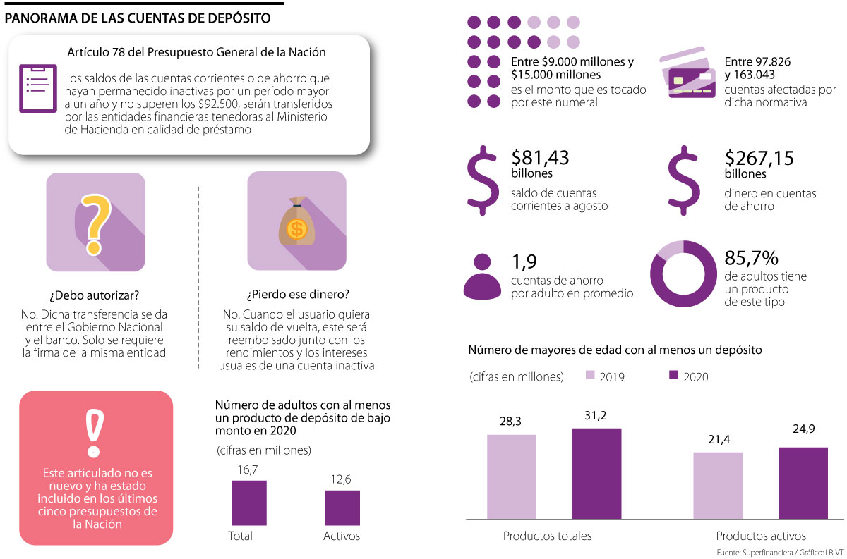 Con la aprobación del Presupuesto General de la Nación para 2022 en el Congreso de la República, se dio luz verde a un artículo que facilita el préstamo de los saldos de las cuentas corrientes o de ahorro que hayan permanecido inactivas por un período mayor a un año y que no superen las 322 Unidades de Valor Real (UVR) o $92.414. Este numeral ha sido aprobado durante los últimos cinco años y busca financiar las arcas públicas.