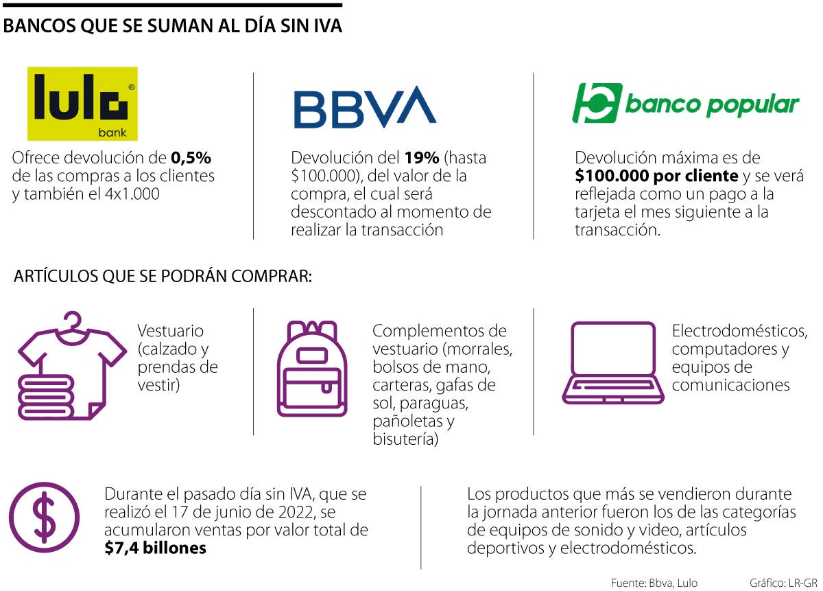 Banco Popular es otra de las entidades que se han sumado en apoyo a esta jornada. Para el Día sin IVA del 17 de junio de 2022, estipuló beneficios de devolución máxima de $100.000 por cliente, la cual se veía reflejada como un pago a la tarjeta de crédito el mes siguiente a la transacción. Esto correspondía a la devolución de 20%. Asimismo, la entidad también estableció una alianza con Almacenes Oportunidades para generar descuento adicional de 10% en la compra sobre referencias seleccionadas.