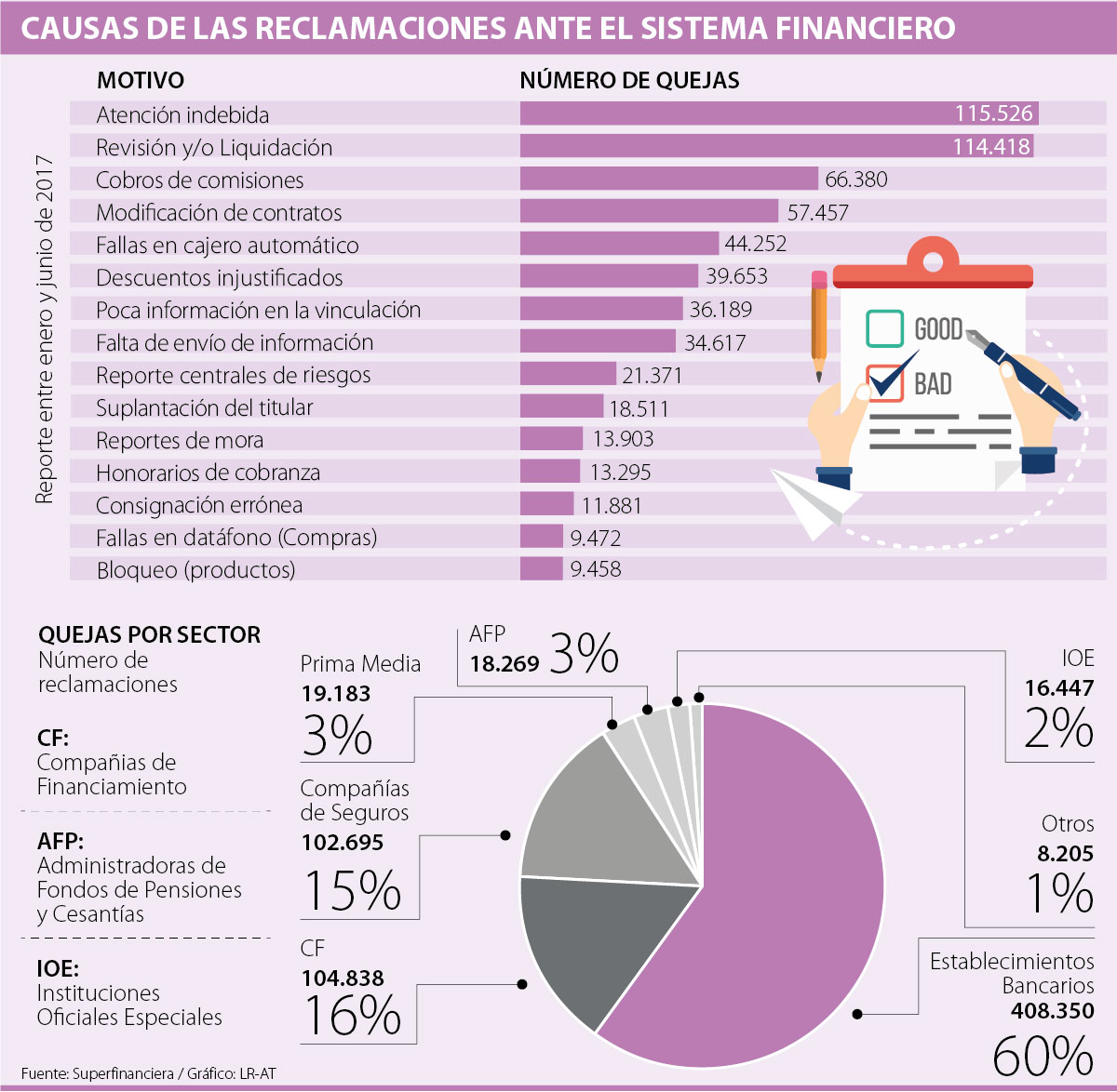 Entre enero y junio se recibieron 677.987 quejas, 10,56% más si se compara con el mismo periodo del año anterior. Del total de las reclamaciones, 408.350 fueron para los bancos, es decir 60%, luego 16% llegaron por malos procesos con las compañías de financiamiento, 15% con las aseguradoras, 6% para los fondos de pensiones y 2% para las instituciones oficiales.