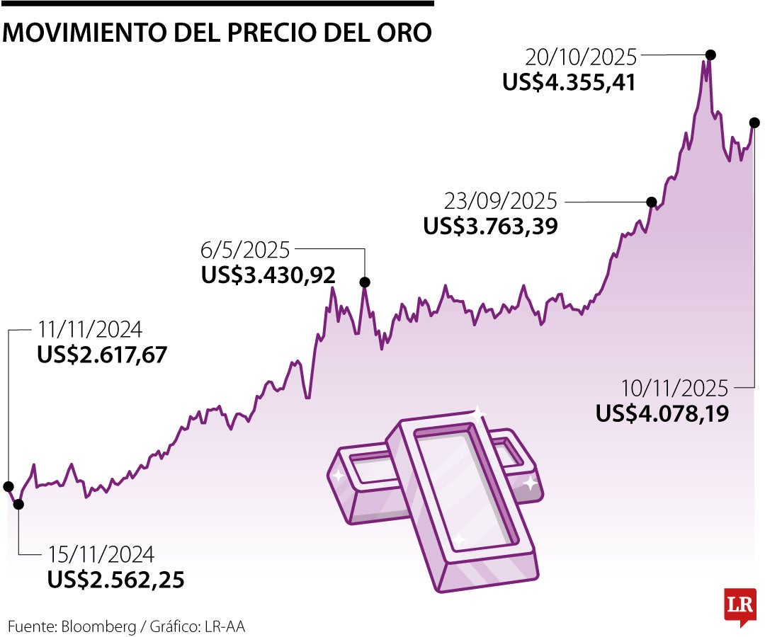 El oro al contado ganó 2%, a US$4.078,45 por onza, su máximo desde el 27 de octubre. El oro en Estados Unidos para entrega en diciembre mejoró 1,9%, a US$4.087,1